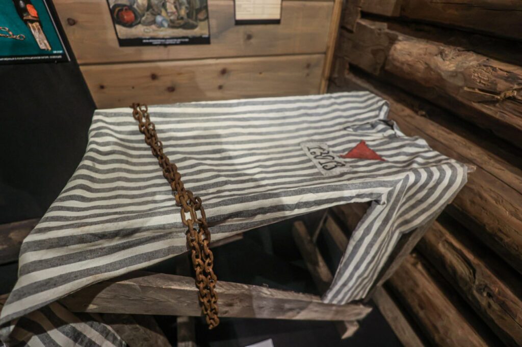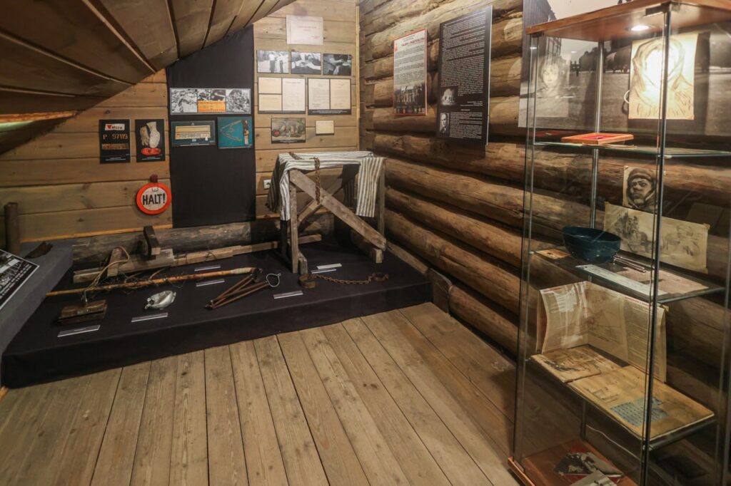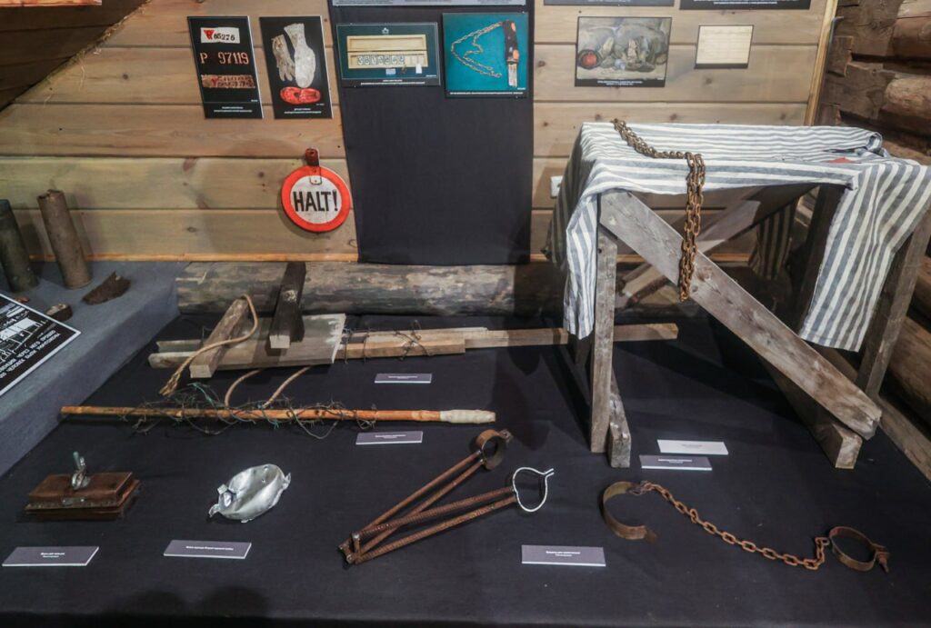 Устройства и предметы для пыток узников: палку для избиения заключенных и палку для фиксации заключенных, пресс для ломания пальцев, кандалы и другие предметы жуткого лагерного быта.