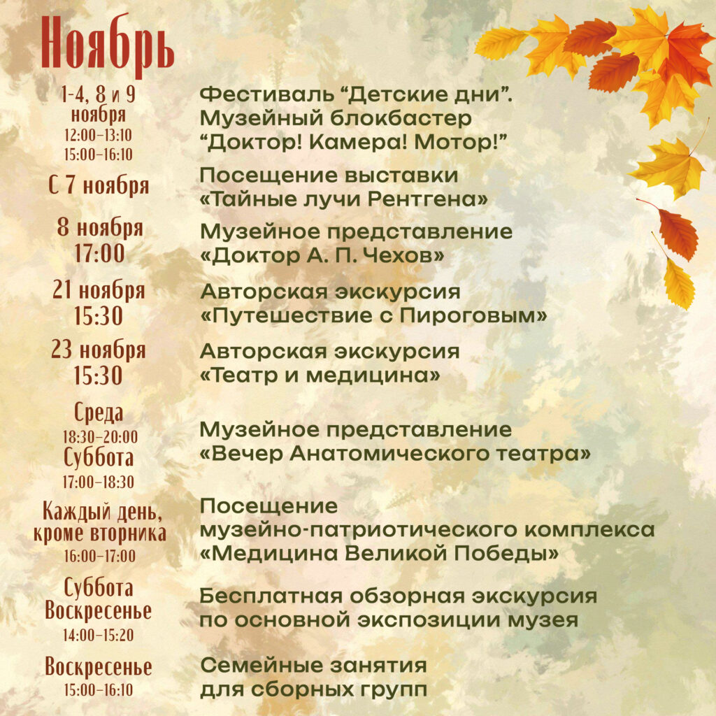 Публикуем афишу на ноябрь! Планируйте посещение Военно-медицинского музея заранее в удобное для вас время! Стоимость: Авторские экскурсии 550 руб. (по льготе — 450 руб.). Без записи. Купить билеты можно в кассе музея или по ссылке Музейное представление «Вечер анатомического театра»: 500 руб., без льгот. Без записи. Купить билеты можно в кассе музея или по ссылке […]