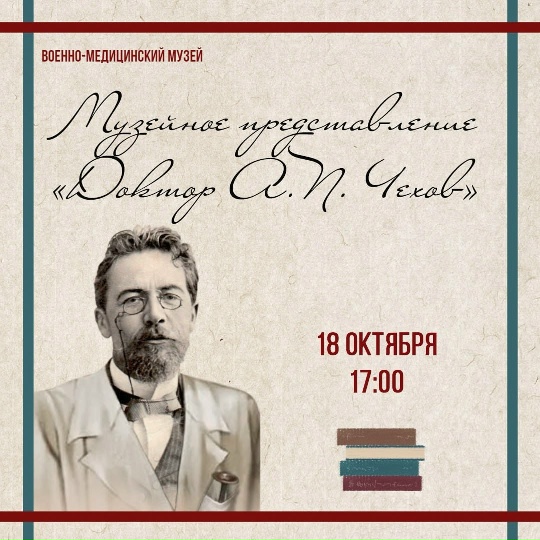 По вашим многочисленным просьбам Военно-медицинский музей запланировал показ театрализованного представления «Доктор А. П. Чехов» 18 октября, в 17:00! Представление раскрывает личность Антона Павловича не только как великого писателя и драматурга, но прежде всего, как прекрасного врача. В постановке использованы выдержки из воспоминаний, личные письма, отрывки из произведений А. П. Чехова. Сотрудники музея подготовили театрализованное представление […]