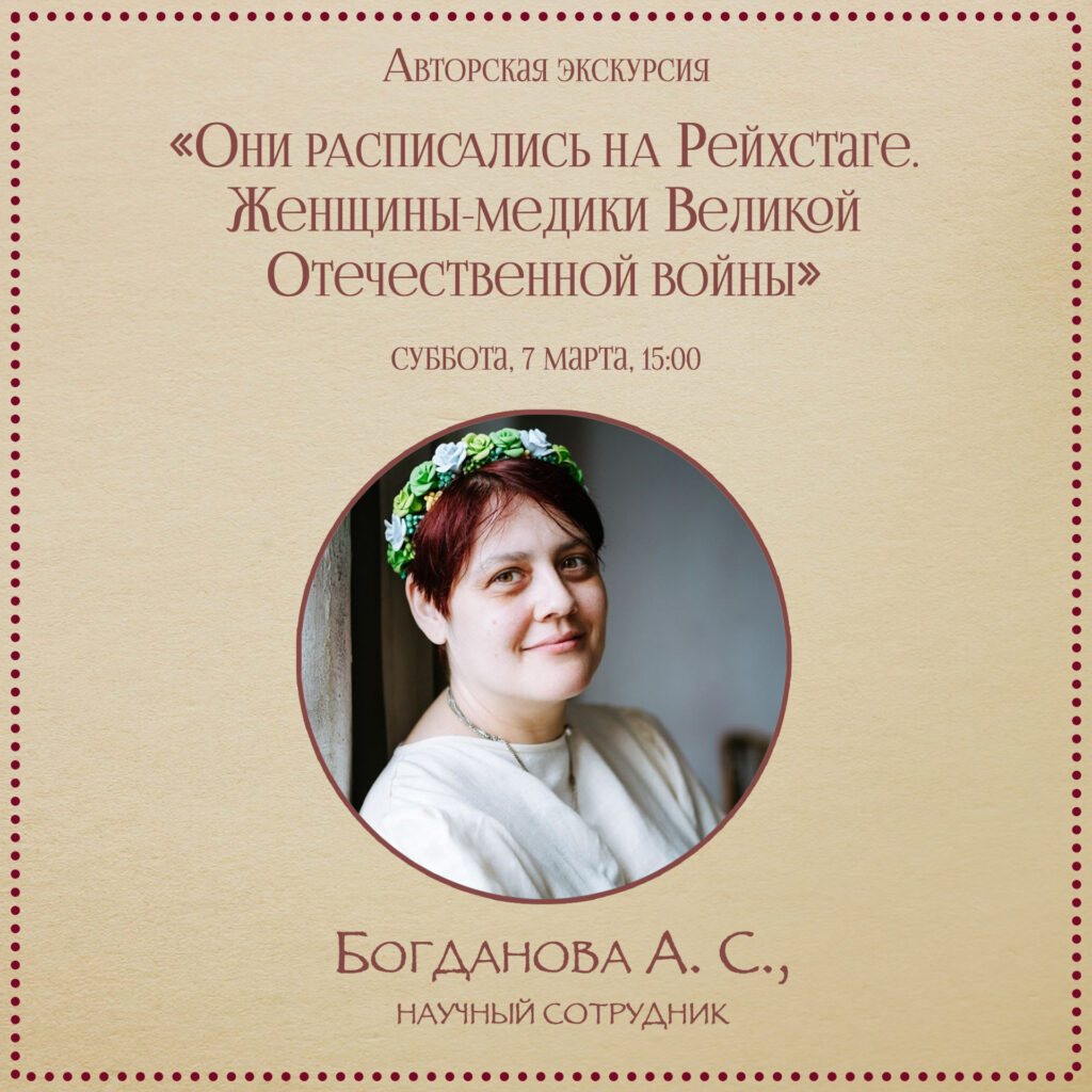 7 марта, 15:00: Авторская экскурсия Александры Богдановой по выставке «Они расписались на Рейхстаге. Женщины-медики Великой Отечественной войны» Приглашаем вас посетить выставку «Они расписались на Рейхстаге. Женщины-медики Великой Отечественной войны», открытой в честь 80-летия Великой Победы! Научный сотрудник Александра Богданова поведает о судьбе 5 героев, внёсших огромный вклад в спасение раненых и больных советских воинов. Эти […]